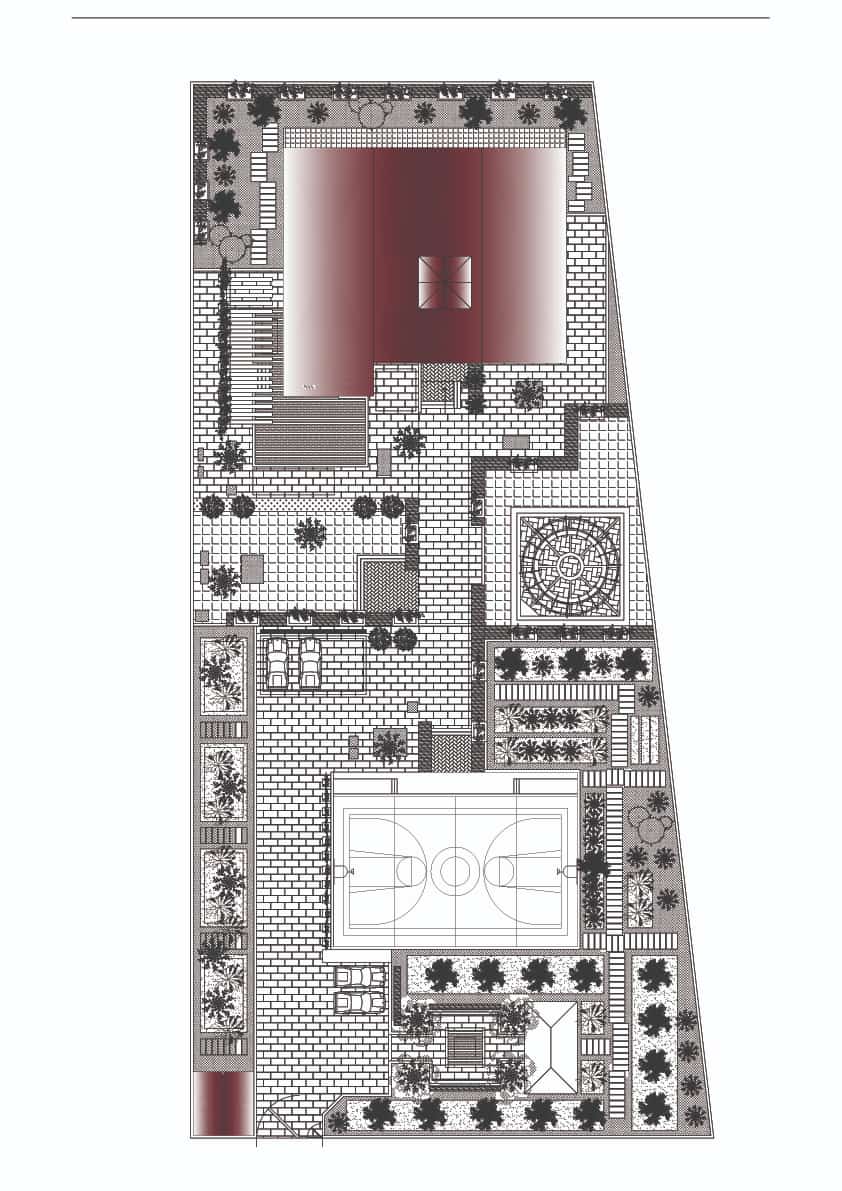 در سایت پلان پروژه هدهد، ترکیبی از فضای سبز، مسیرهای حرکتی، بخش ورزشی و نشیمنهای باز طراحی شده است. زمین چندمنظوره ورزشی، باغچهها و درختان در کنار فضای مرکزی، محیطی سرزنده و کارآمد برای استفادههای جمعی فراهم آوردهاند.