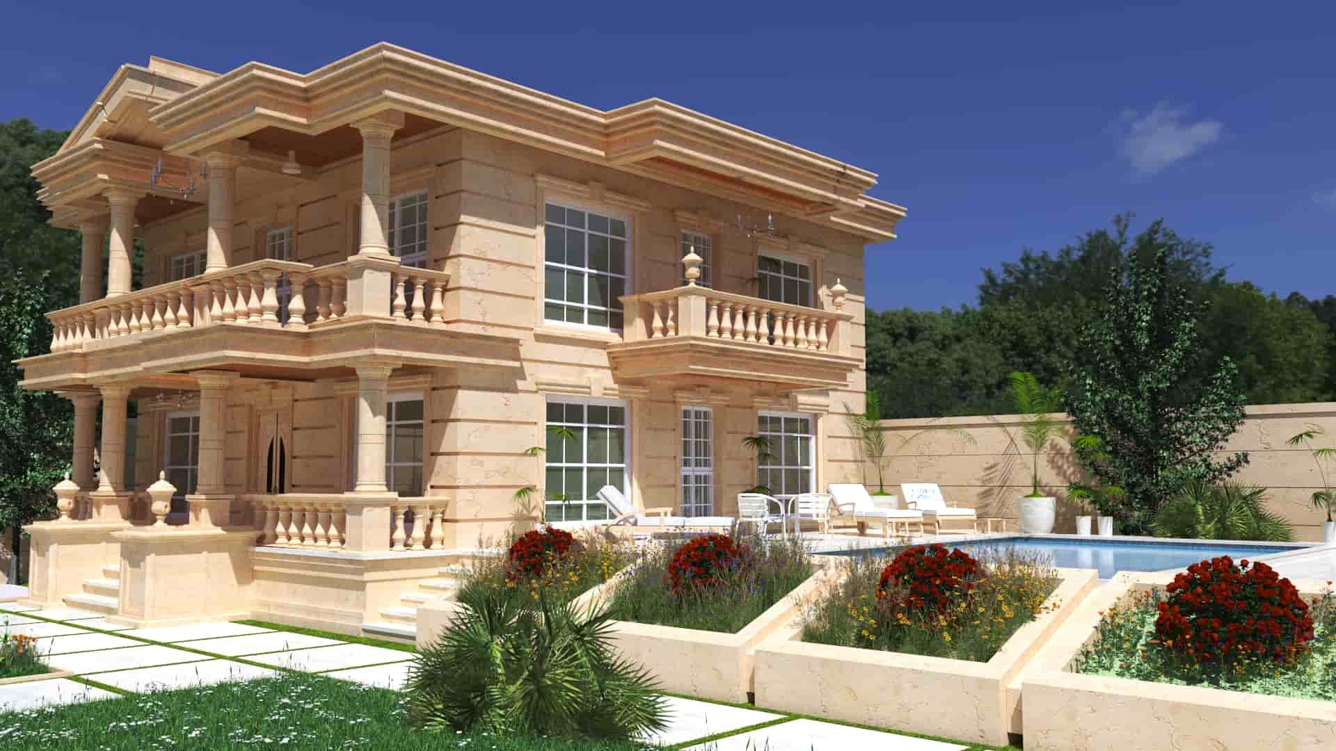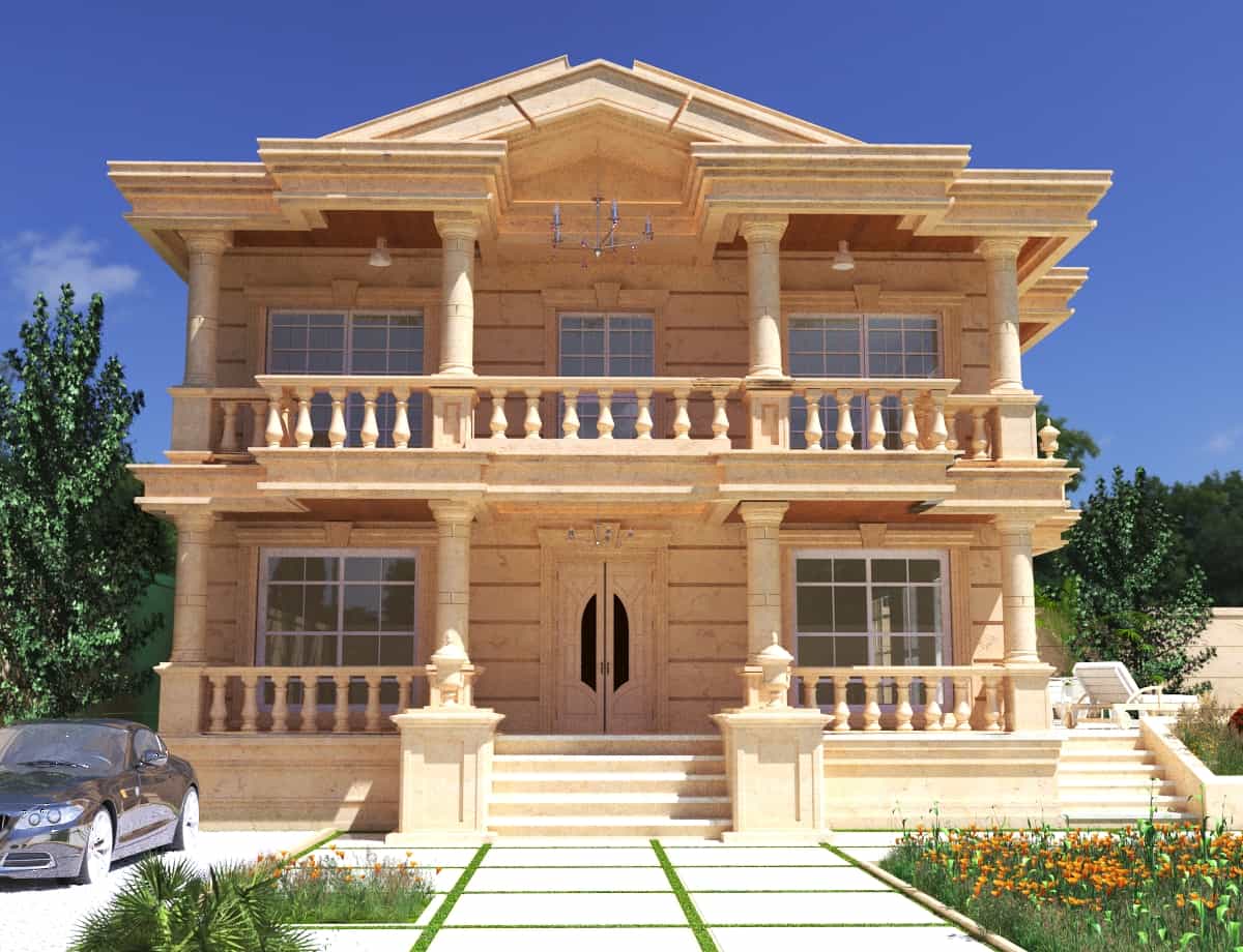نمای اصلی ویلا با استفاده از سنگ روشن و حجاریهای دقیق بر روی ستونها و نردههای بالکنها، جلوهای مجلل و باشکوه به بنا بخشیده است. ترکیب تناسبات کلاسیک با خطوط قرینه، حس استحکام و عظمت را القا میکند.